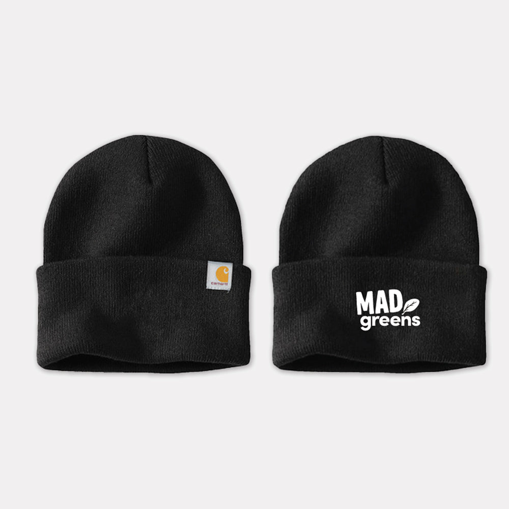 Logo: Mad Greens. Logo Placement: Opposite Side of Carhartt logo, Centered from top to bottom. Thread Color: Solid White