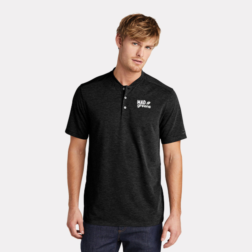 OG148: OGIO Evolutionary Henley Polo. Logo: Mad Greens. Location: Left Chest. Thread Color: Solid White.